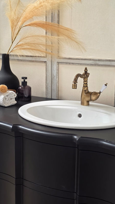 €1.489,00Grundpreis /Nicht verfügbar "Jarmu" - schwarzer Waschtisch mit heller Marmorplatte im Landhausstil
