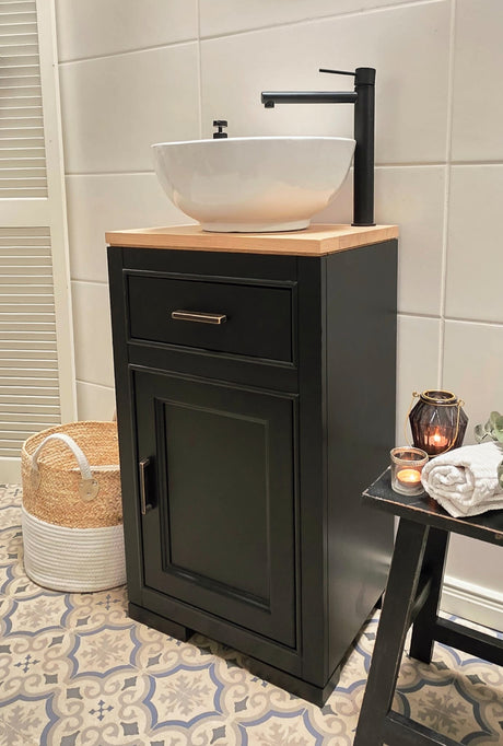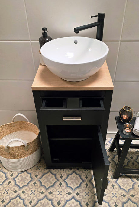 Determine the color, fittings and size yourself - Our washbasins, newly carpentered from solid wood (spruce, some oak tops) according to antique construction plans, can be customized in terms of colour design, choice of fittings and even dimensions. Simply let us know your special requests in the order form or ask for advice: [email protected] or +49 (0)40 879 34 700.