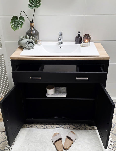 €795,00Grundpreis /Nicht verfügbar"Elodie" - Waschtischunterschrank, Keramik-Waschbecken mit Massivholz-Unterschrank, weiß 85 cm