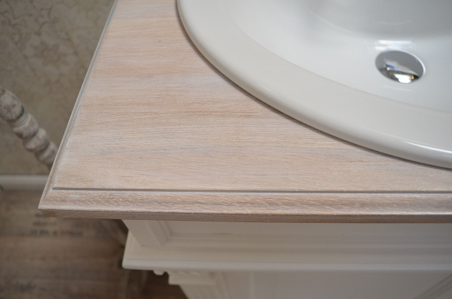 Elegant, romantisch und ganz im Stil des Landhaus-Chic verzaubert der anmutige Doppelwaschtisch "Almerá" das Badezimmer. Mit vielen liebevollen Details im Stil der Gründerzeit präsentiert sich die Front. Die eleganten Kassettenverzierungen hingegen schmücken nicht nur die Front sondern sind auch seitlich zu finden und unterstreichen damit den massiven, eleganten Charme des schönen Badmöbels. Die Beschläge lehnen sich an die Jugendstil-Epoche an und sind feine Tropfenbeschläge aus Messing und Keramik. Die massive Eichenplatte wirkt dank der besonderen Versiegelungstechnik leicht und elegant: weiß-transparent lässt sie die schöne Maserung des Holzes durchschimmern und wirkt dadurch nicht zu schwer.