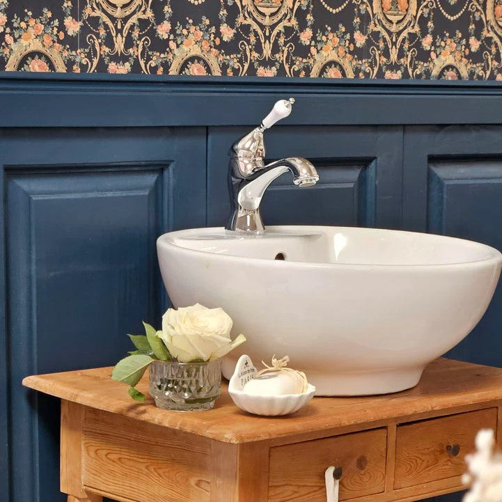 High-quality, Italian tap, nostalgic with white lacquered single-lever mixer. Suitable for all washbasins where the tap sits on the basin, i.e. with a tap hole.