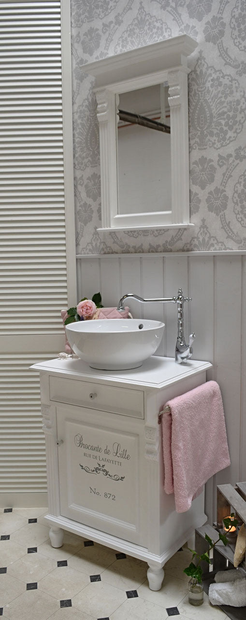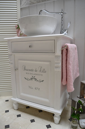 Fresh colors, light nuances and loving details bring a sunny mood into the bathroom. The graceful "Lillejon" washbasin enchants with its French and nostalgic-looking lettering, rural charm and floral ornaments. The nostalgic-looking towel rail always keeps the terry towel to hand and is extremely decorative in addition to its practical function. The ornaments are hand-carved and lend the vanity unit its nostalgic noblesse.