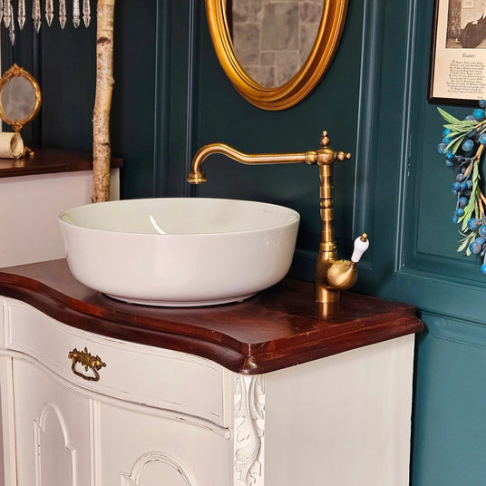 Weißer Rahmen für ein ausdrucksstarkes MöbelstückIn diesem Badezimmer entsteht ein harmonisches Zusammenspiel aus klarer Raumgestaltung und nostalgischer Möbelauswahl. Die weißen Wände wirken ruhig und zurückhaltend – genau der richtige Hintergrund...