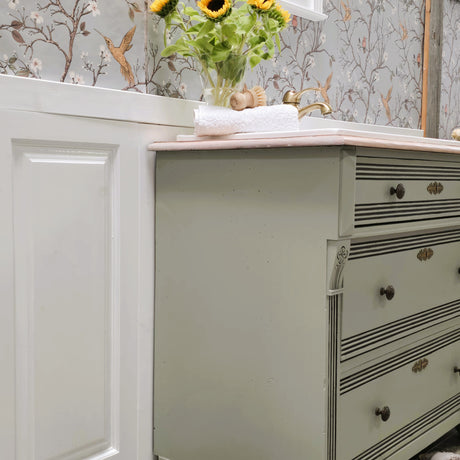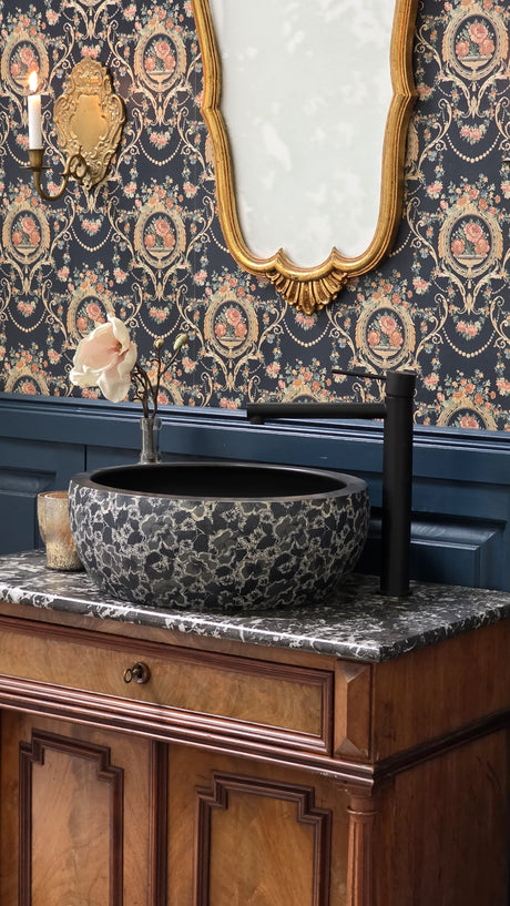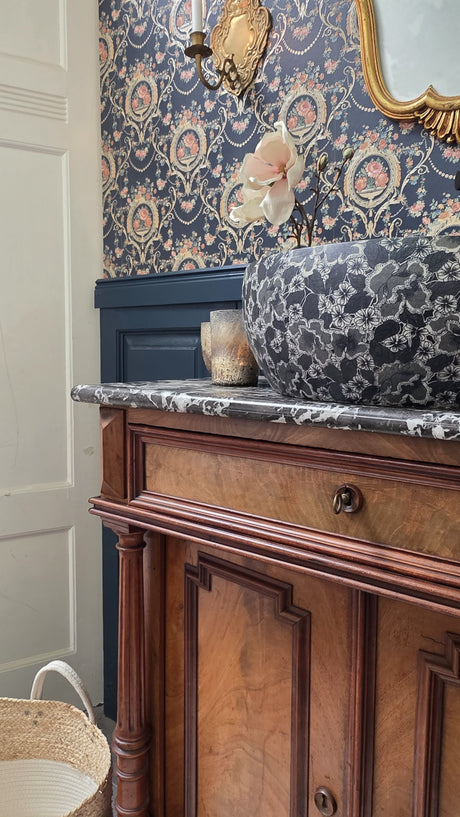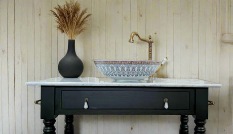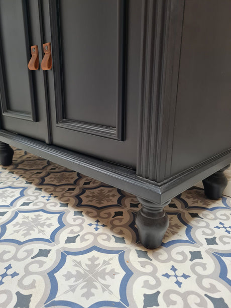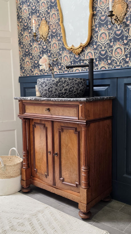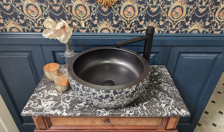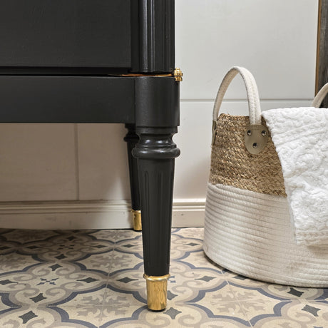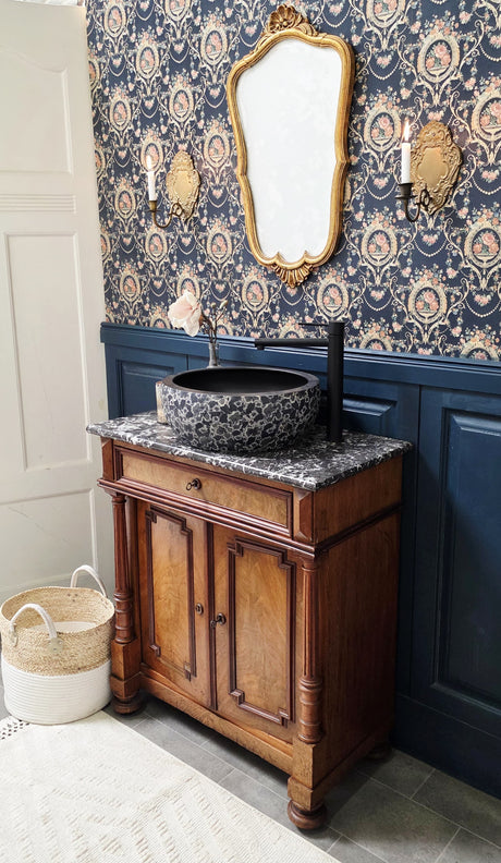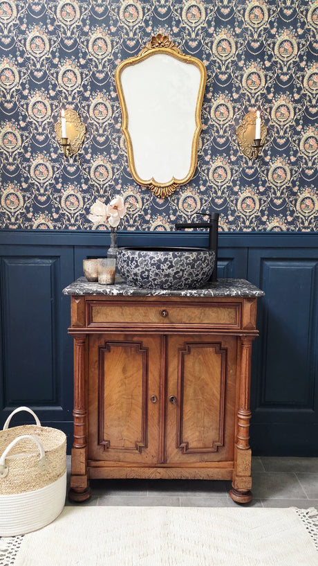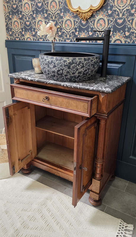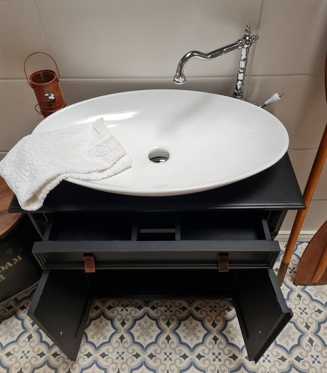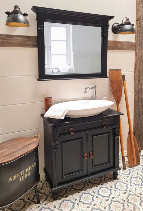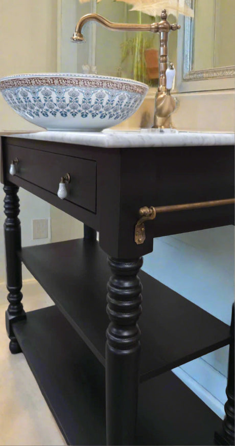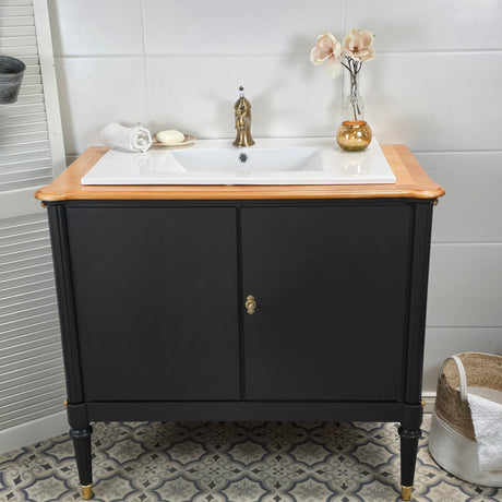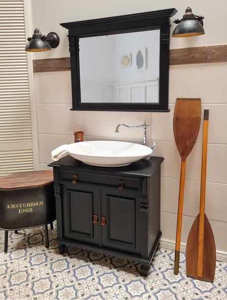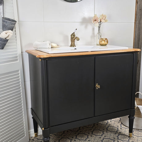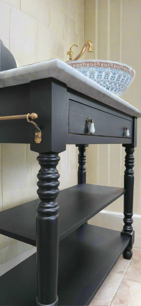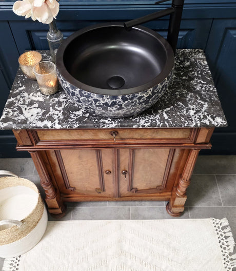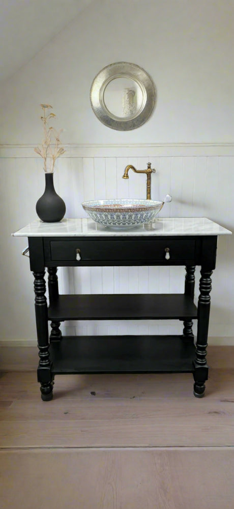"Jarmu" - schwarzer Waschtisch mit heller Marmorplatte im Landhausstil