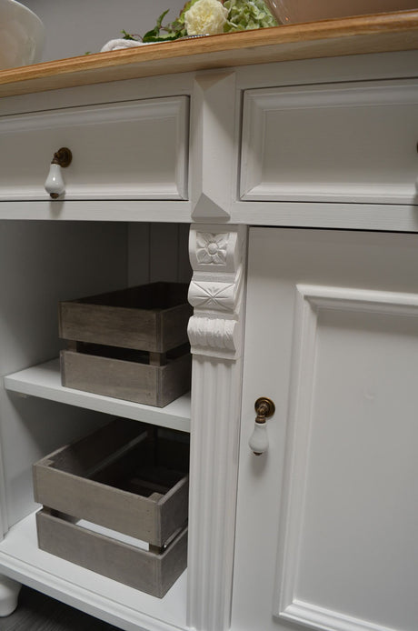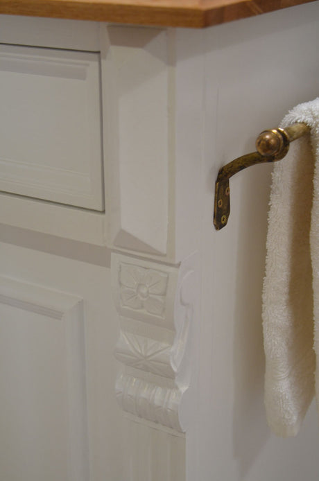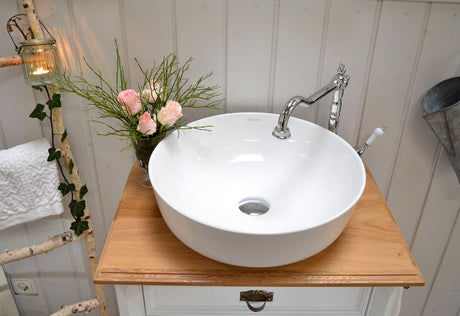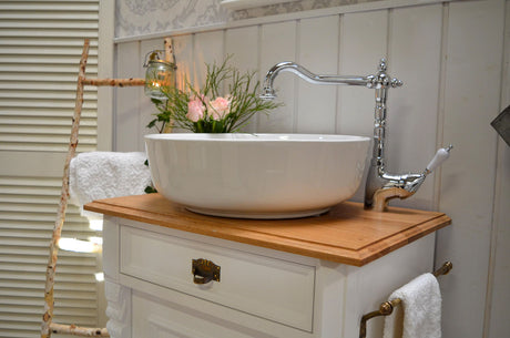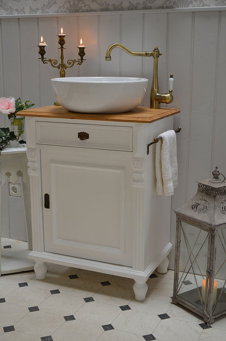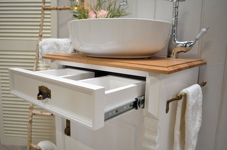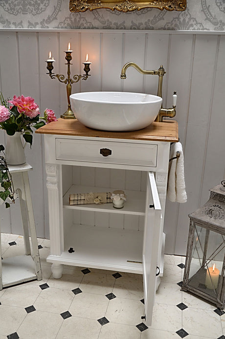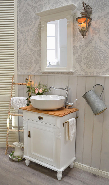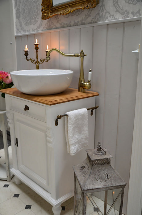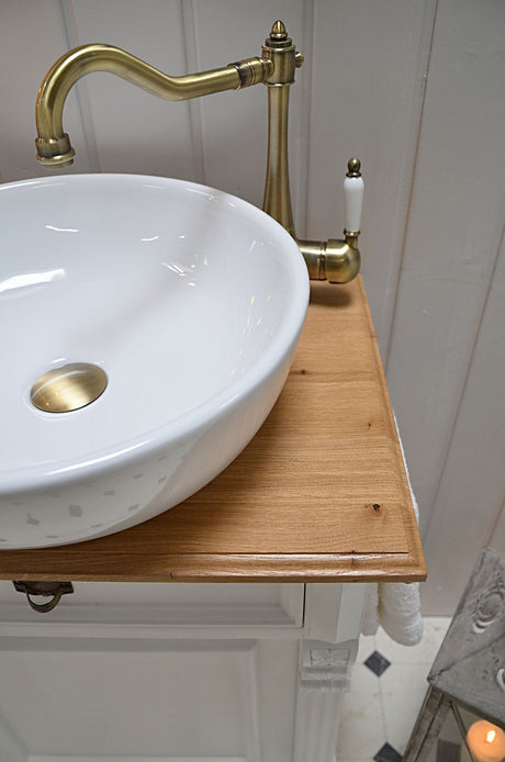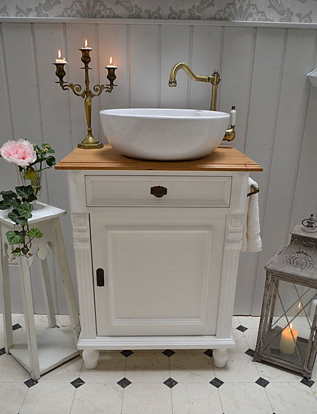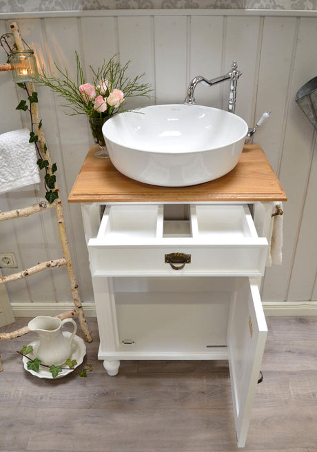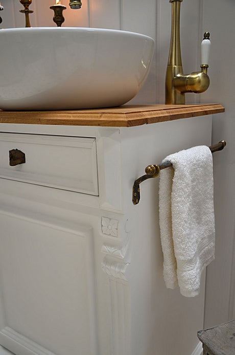 €995,00Grundpreis /Nicht verfügbar"Grenadine" weißer Landhaus-Waschtisch mit Eichenplatte und Handtuchstange 70 cm
