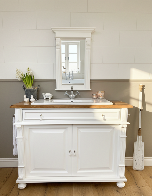 Lavabo blanc de style campagnard « Flers » avec plateau en chêne, 120 cm