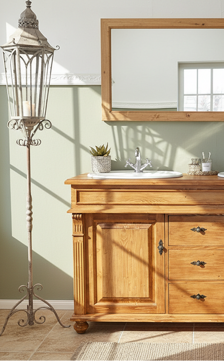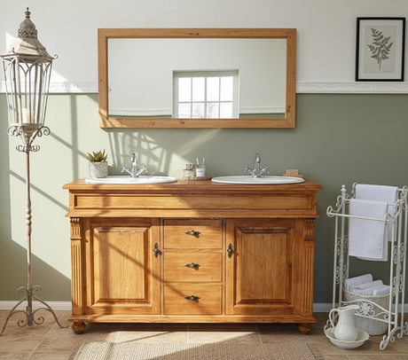 On adore le bois dans la salle de bain ! Cet espace, généralement dominé par les carreaux et la céramique qui dégagent une impression de froideur, appelle le bois, car aucun autre matériau n'apporte autant de chaleur et de confort. Heureusement, chez Land & Liebe, nous pouvons protéger le bois avec une finition hydrofuge, pour qu'un meuble-lavabo en bois massif puisse bientôt embellir votre salle de bain. De plus, le bois massif est nettement plus durable que les panneaux de particules ou le plastique, comme le prouvent nos commodes anciennes.