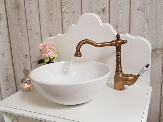 Unsere Retro-Armatur ist speziell für Waschbecken konzipiert, die keine Bohrung für eine Armatur haben. Meist sind dies Waschbecken, die auf der Deckplatte des Waschtisches stehen.