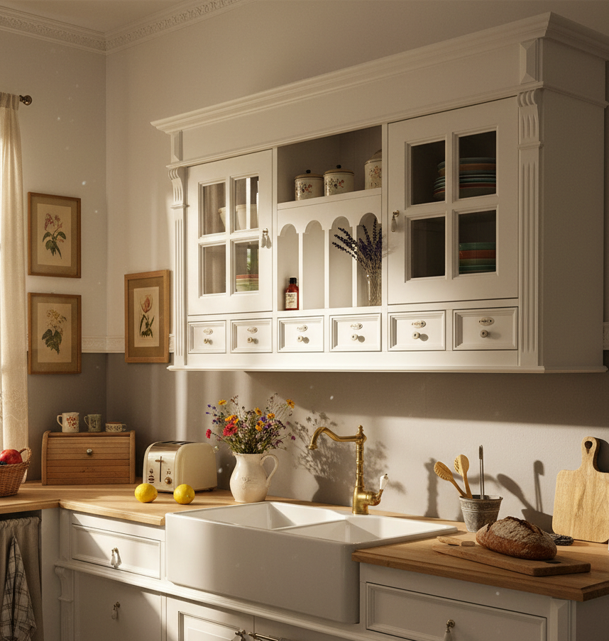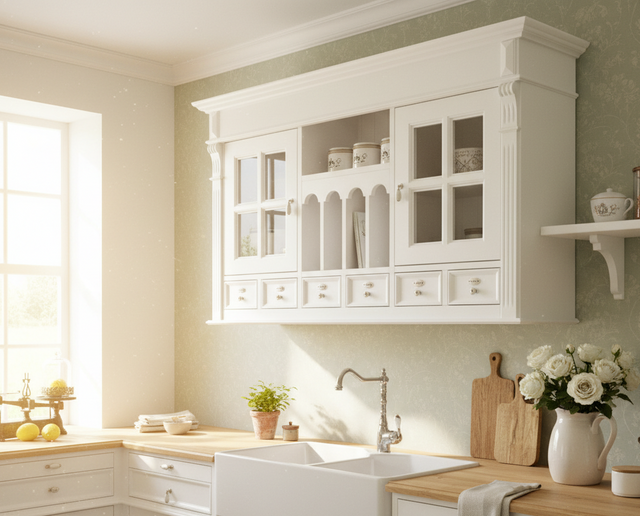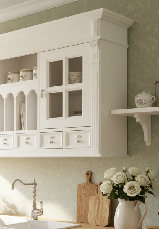Der Küchenhängeschrank im Landhausstil ist ein detailverliebtes Schmuckstück , das mit seinem romantischen Charme und seiner nostalgischen Ästhetik das Herz jedes Küchenliebhabers höher schlagen lässt. Hergestellt aus robustem Massivholz, strahlt er eine natürliche Schönheit aus und verleiht der Küche einen Hauch von ländlichem Flair. Sein frisches Weiß bringt Licht und Leichtigkeit in den Raum, während die romantischen Dekore im Stil der Gründerzeit Epoche an vergangene Zeiten erinnern.