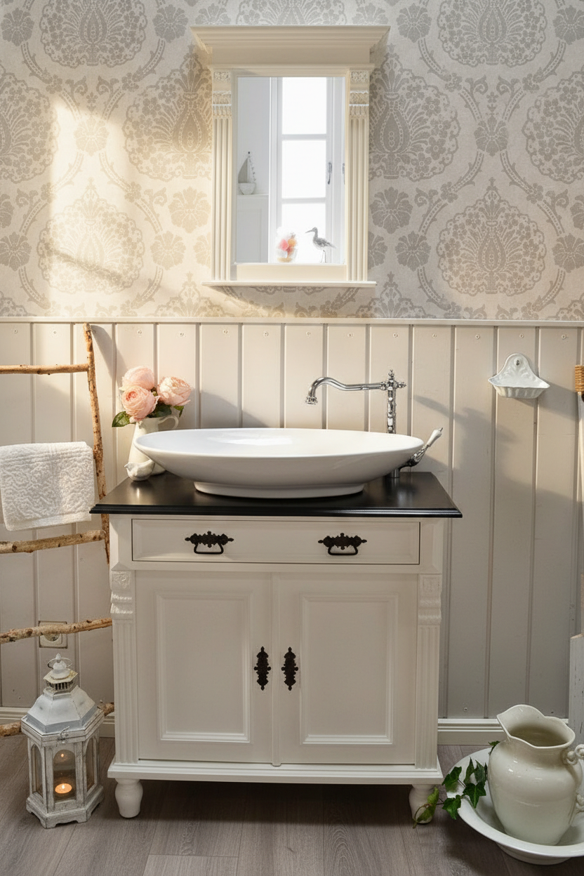 Als kleine Auszeit vom Alltag verweilt man gerne im eleganten Badezimmer und genießt modernen Komfort, gepaart mit nostalgischen Design. Der elegante Waschtisch "Océane" verzaubert mit seinen handgeschnitzten floralen Zierelementen, den Kassettenverzierungen und den filigranen, patinierten Beschlägen. Sein frisches Weiß verleiht dem Bad Leichtigkeit und passt sich wunderbar allen Einrichtungstilen an. In markanter Kontrastsprache dazu bietet die Deckplatte im eleganten schwarz ein schönes Pendant und verleiht somit dem Waschtisch seinen besonderen Charme.